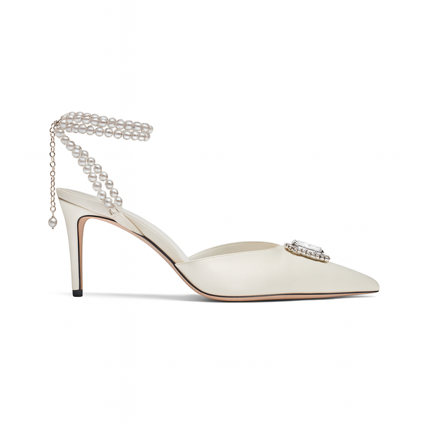 A lower heel. No less majestic. Introducing The Dame 75 — a striking reinterpretation of our crown jewel, reimagined for day-to-night versatility. This sculptural mid-heel stiletto features a lustrous silk satin upper, adorned with a radiant diamanté crystal embellishment and our signature riviére-style Maiorca pearl ankle strap. Handcrafted in Italy for impeccable comfort and elegance, The Dame 75 is the perfect balance of quiet opulence and everyday elevation. Designed for women who want to command attention — without ever raising their voice.